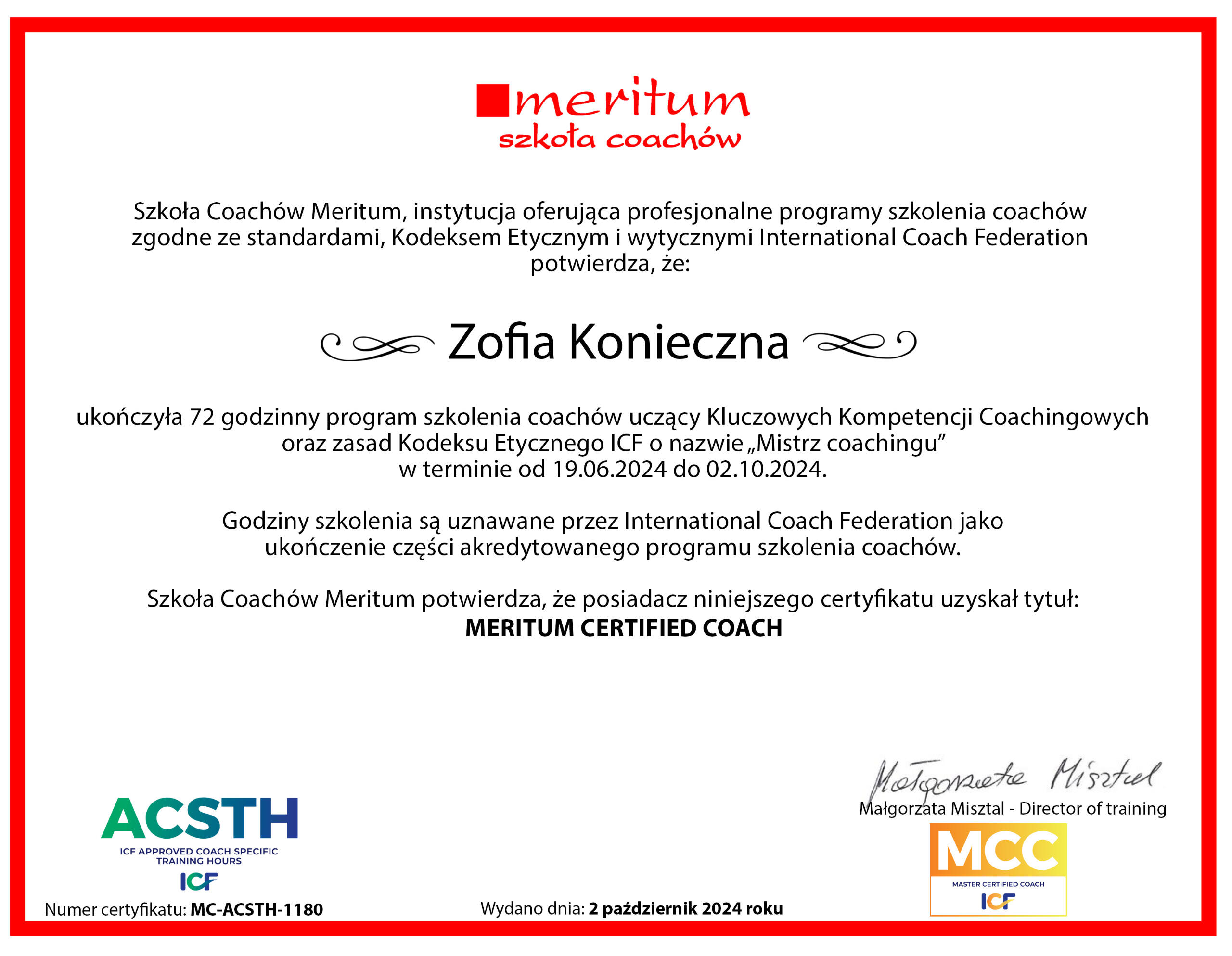 Rozwój zawodowy: Uzyskałam certyfikat coacha w szkole coachów Meritum i jestem chętna i gotowa dzielić się swoją wiedzą oraz doświadczeniami z osobami gotowymi na rozwój i poszukiwanie swojej ścieżki.